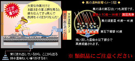 ※「嵐の湯薬石浴」には、この他特殊技術が数多くあります。これには、特許申請、実用新案登録で当社だけの技術となっております。当社とよく似た商品・施設にご注意ください。